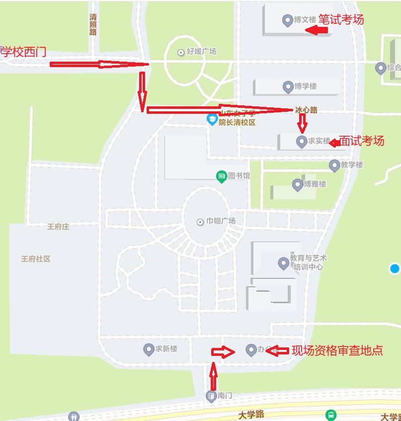 参加资格复审的应聘人员须从学校南门凭准考证、身份证(原件)、山东省电子健康通行码(绿码)进入,自驾车辆无法进入校区。