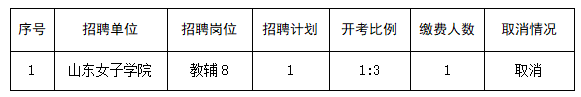 2022年山东女子学院公开招聘工作人员报名工作已结束。根据《山东女子学院2022年公开招聘工作人员简章》规定,报名结束后,应聘人数达不到规定比例的招聘岗位,计划招聘1人的,取消招聘岗位。现将取消招聘岗位情况予以公告。
